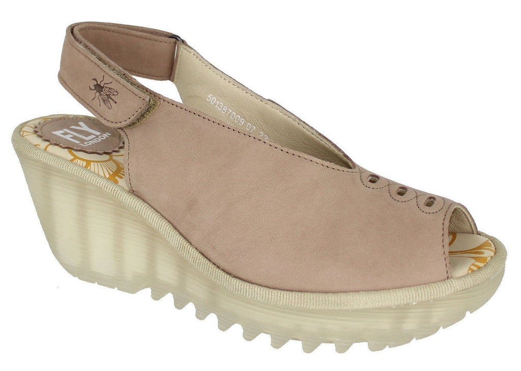 The FLY LONDON YEAY387 combines stylish design with functionality. Crafted from soft nubuck leather, it features a peep toe and a velcro slingback for easy adjustability. Its neutral color and dressy casual style offer versatility, making it suitable for various occasions while ensuring comfort during wear.